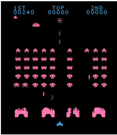 The first kinds of aliens are always at the bottom of the formation and they award 10 points each. The next alien on the formation drops bombs on the players and they award 20 points each. The extra-terrestrials on the third line of the formation are worth 30 points each and they are capable of dropping missiles as well. The last types of aliens are the Mystery aliens, they appear randomly on the screen. Points scored by killing the mystery aliens are not fixed and each of them an award from 100 to 500 points.