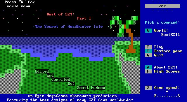 Best of ZZT is a kind of sequel to ZZT and Super ZZT. It is a shareware game that showcases what ZZT can do.Epic MegaGames created ZZT with its game worlds and released it together with its level editor and world creation tools. This proved hugely popular and led to many home made worlds being created and shared on-line via bulletin boards. In 1991 Epic held a Game Design Contest to find the best of these game boards and they received over one thousand entries. Game boards from this contest were used to create two new game worlds, 'The Secret of Headhunter Isle' and 'Royal Treasures' which Epic released as shareware in 1992 under the name Best of ZZT.