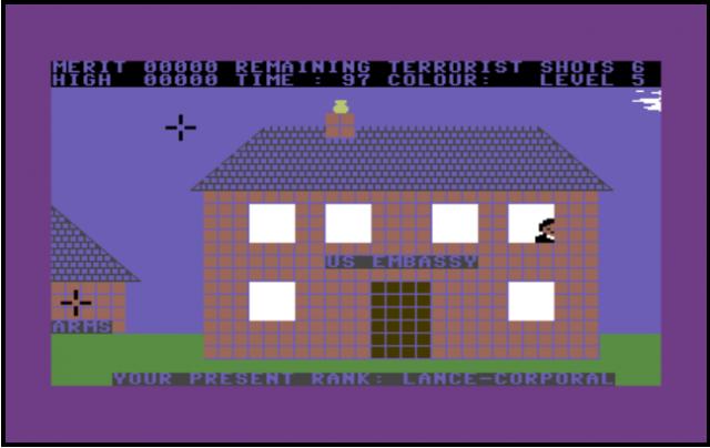 You are a member of the S.A.S. and you have been sent to an American Embassy to shoot terrorists that are holding hostages. The game is a 1st person shooter with the whole embassy building on the screen. There are a number of windows and terrorists or hostages will slide past the various windows in a different color top. As the people appear in the windows you are told what colour the terrorists are wearing and these have to be shot by moving a cross-hair and pressing fire.