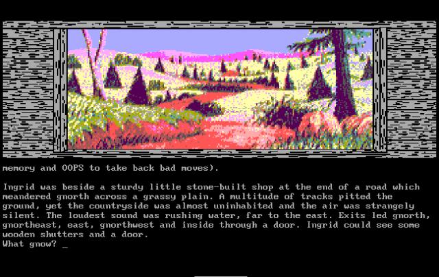 Instructions can be issued to other characters, with words like THEN, FIND and GIVE to join them. This co-operation is essential to solve many puzzles, and takes place in a world where characters have their own aims and motives. There are BRIEF and VERBOSE modes of text. A running joke in the game is that the screen display adds a 'g' to the start of all words beginning with n - 'gnorth' and 'gnugget' for example.
