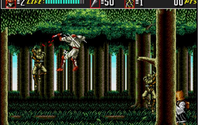 The D-pad controls Shinobi's movements, while the action buttons C, B and A are used to jump, throw knives (sword-slash) and perform a special ninjitsu technique respectively. Shuriken, as always, are the basic staple of Shinobi's attacks. He can throw them straight toward his enemies one at a time or launch ten at once during a somersault. In addition, the power-up bonus triples all knife damage as well as enhancing Shinobi's close-combat skills.