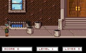 In the fourth level Kevin must navigate his way through Duncan's Toy Chest staying clear of the numerous different toys that try to kill him and Marv and Harry.In the fifth level Kevin must once again make his way across town to get to his uncle and aunt's house all the while battling thugs, men throwing bottles from a window, cats, rats, birds, and the wet bandits along the way. It is at this point the wet bandits now possess new attacks such as Marv's jumping leap attack and Harry can now toss a bag of unknown contents at Kevin making the game more challenging. In the sixth level Kevin has to travel through a pipe leading to his aunt and uncle's house and with a flyswatter handy he fights his way to the end swatting hornets and bubbles.