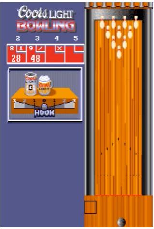 Coors Light Bowling is a themed version of Capcom Bowling, a similar bowling arcade game also by Capcom. The game features themes of the Coors Light beer popular in the 80s. From a top-down perspective, a bowling lane is displayed near a scoring board. You can either play alone, in this case, the computer competes against you. In a multi-player game, up to 4 players can compete against each other and each of them takes turns to throw the bowling ball in the direction of the pins. The pins are arranged at the end of the lane, just like it is done in a real bowling game. With the controls, you can aim your ball before throwing it. If you aim your ball properly, you have a high chance of hitting all the pins at the end of the lane.