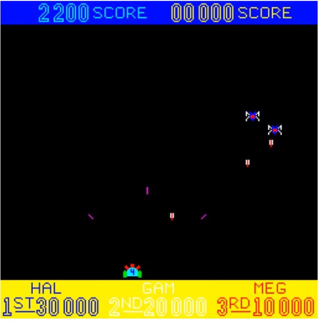 Megatack is a space shooter arcade game where players battle against different space creatures trying to approach their spaceship and destroy it. Apart from regular space monsters that flood the field of play once the game starts, there are also motherships in form of giant rings floating at the topmost part of the screen after each round of regular space aliens. Instead of having bosses appear after a wave of regular space monsters, the game alternates regular levels with the difficult levels. The regular monsters emerge at the top of the screen and slowly make their way down to where the player’s ship is stationed, players must then destroy each of them as they approach. The monsters who manage to escape projectiles from the player’s spaceship tries to crash into the spaceship once they reach the bottom part of the screen. Also in this round of the game, space monsters are about 25 in number but only 8 of them are present on the screen at the same time.