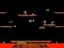 To defeat the enemy knights, players must flap their steed's wings and strike from a higher jousting position, destroying the vulture and its rider. Each successful hit causes an egg to descend onto one of the platforms below. The heroic knights must swiftly destroy the eggs before they hatch, unleashing new and increasingly challenging adversaries. The enemy knights come in three strengths: Bounder (red knight), Hunter (white knight), and Shadow Lord (blue knight). However, these knights are not the sole obstacles within the game. Players must also navigate crumbling platforms, evade lava trolls trying to drag knights into the fire, and face the formidable and seemingly unbeatable pterodactyl.