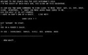 Lost Dutchman's Gold is a text based adventure game. Your goal in the game is to find the legendary lost Dutchman's gold. You begin the game in a miner's shack; searching about, you find a map which seems to indicate where the lost gold is located. Now you'll set out on a dangerous quest through deserts, mountains, and even ghost towns in order to locate the mine where the gold is buried. The ghost of Back-Pack Sam (better known as the computer) will guide you on your quest by providing descriptions and clues. You get around and interact with the game by entering two word commands.