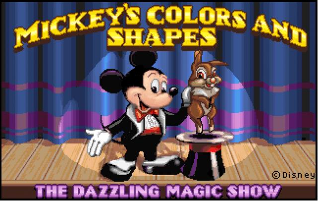 Mickey's Colors and Shapes is a DOS educational game for kids to learn different shapes. Level have various characters and objects that are hidden behind shapes that the child has to identify using the keyboard keys that originally had stickers with the shape that went over the keys.