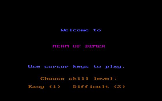 A Compute! Magazine type-in BASIC title featuring Nerm the Worm, who is trapped in Bemer Castle and would like nothing more than to escape (and consume a generous helping of "magic mushrooms" along the way). Yet another variation on Snake where the player controls a serpentine crawler in perpetual motion, which must be guided to consume food, dodge deadly walls, and avoid biting its own tail.The castle is composed of eleven rooms, each trickier to navigate than the last. In a vaguely Carrollian manner, the rooms are prone to sprouting mushrooms which cause Nerm to grow as he eats them: after consuming five mushrooms, the exit doors will open, leading to the next room. Extra lives are awarded along the way, presumably another effect of the magical fungi. When the game is over, a verbal ranking is given based on the player's progress, ranging from "zero" to "hall of fame".