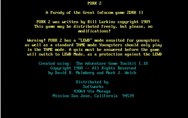 Pork 2 is a parody of Zork II and a sequel to Pork I: The Great Underground Sewer System. A distraught waitress working at the Cajuin Fried Chicken House explains to the player that a unusual large Chicken Gizzard escaped from the Chicken House and is now terrorizing the neighborhood as a tap dancer at the local Burlesque house.