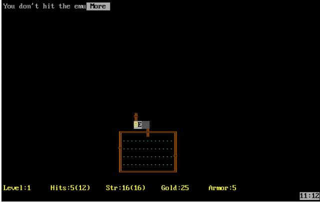 After naming your character, you’re dropped into the dungeon’s first level. Use directional keys to explore rooms, uncover treasures, and encounter enemies.