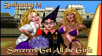 Ernie Eaglebeak is a young lad living with his cruel stepfather Joey Rottenwood, who keeps him locked up in the attic. Ernie is secretly in love with his neighbor Lola Tigerbelly, a young woman definitely out of his league. Things take a turn for the better when Ernie gets accepted as a freshman by the Sorcerer University, a prestigious school of magic. At first Ernie is fascinated by college life and meets a few attractive women as well. However, when the magical Sorcerer's Appliance gets stolen, Ernie is sent on a dangerous mission to recover that powerful device. Armed with his spellbook and a magical surfboard, Ernie must cross the Fizzbuttle Ocean and travel to various islands searching for clues.Spellcasting 101 is the first game created by Legend Entertainment, heralding their hybrid graphical and text adventure format. Continuing Infocom's tradition of humorous text adventures, the game can be played in text-only mode. However, graphical depictions of locations can be activated as well, and the game gives the player the opportunity to combine verbs from a list with on-screen objects in an almost point-and-click fashion. The game contains many puzzles following a peculiar sense of logic; it is also possible to get irrevocably stuck and die. Magic spells (including such exotic ones as increasing a person's bust size) can be learned and then used in appropriate situations to solve puzzles. The player's actions advance the game's internal clock, and some of the tasks are based on being in the right place at the right time. The islands are tackled as separate scenarios and are self-sufficient gameplay-wise. The game contains many puns and jokes, some of them college-oriented (e.g. Tappa Kegga Bru or I Phelta Thi fraternities). It is possible to activate the "Naughty Mode", which shows the game's female characters semi-naked in some scenes, and also makes the corresponding text descriptions explicitly erotic.