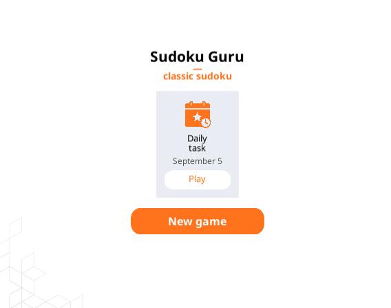 Sudoku Guru is a classic, number-based puzzle game that challenges players to fill a 9x9 grid with digits from 1 to 9, ensuring that no number repeats within any row, column, or 3x3 subgrid. The game offers an engaging blend of logic and strategy, testing players' problem-solving skills and patience. Whether you're a Sudoku novice or a seasoned puzzle enthusiast, Sudoku Guru provides an array of difficulty levels, sleek visuals, and helpful features to guide players through one of the world's most popular brain teasers. With its focus on both accessibility and challenge, this game is perfect for players looking to enhance their logical thinking in a fun and rewarding way.