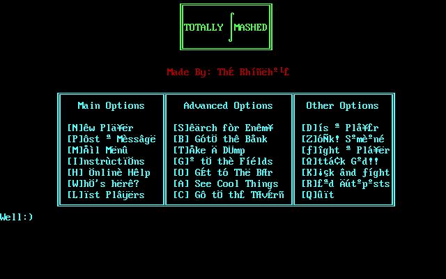 You must engage these insane locals in serial and repetitive single-keypress combats in order to solve the town's problems, and you must also figure out how to read obscene menu options scrawled in entirely high-ASCII characters that were never meant to be used in place of letters—but which are still appropriate for uncommon RPG options like [T]ake a Dump and [Z]lap your Monkey. Enjoy playing Totally Smashed and having fun!